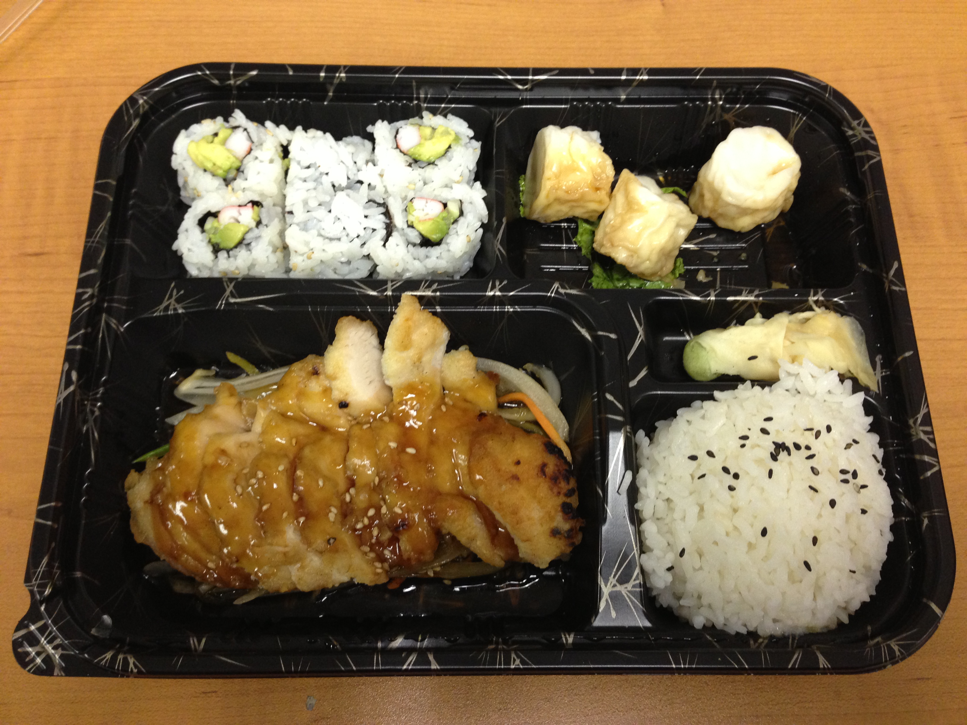 Pictured above is Azuki’s Chicken Teriyaki bento box. It comes with a salad, California roll, steam shrimp dumplings, rice with black sesame seeds sprinkled on top, and chicken in teriyaki sauce with onions and green peppers underneath the chicken. Delicious!! They have other bento boxes as well but I have not tried them yet.
