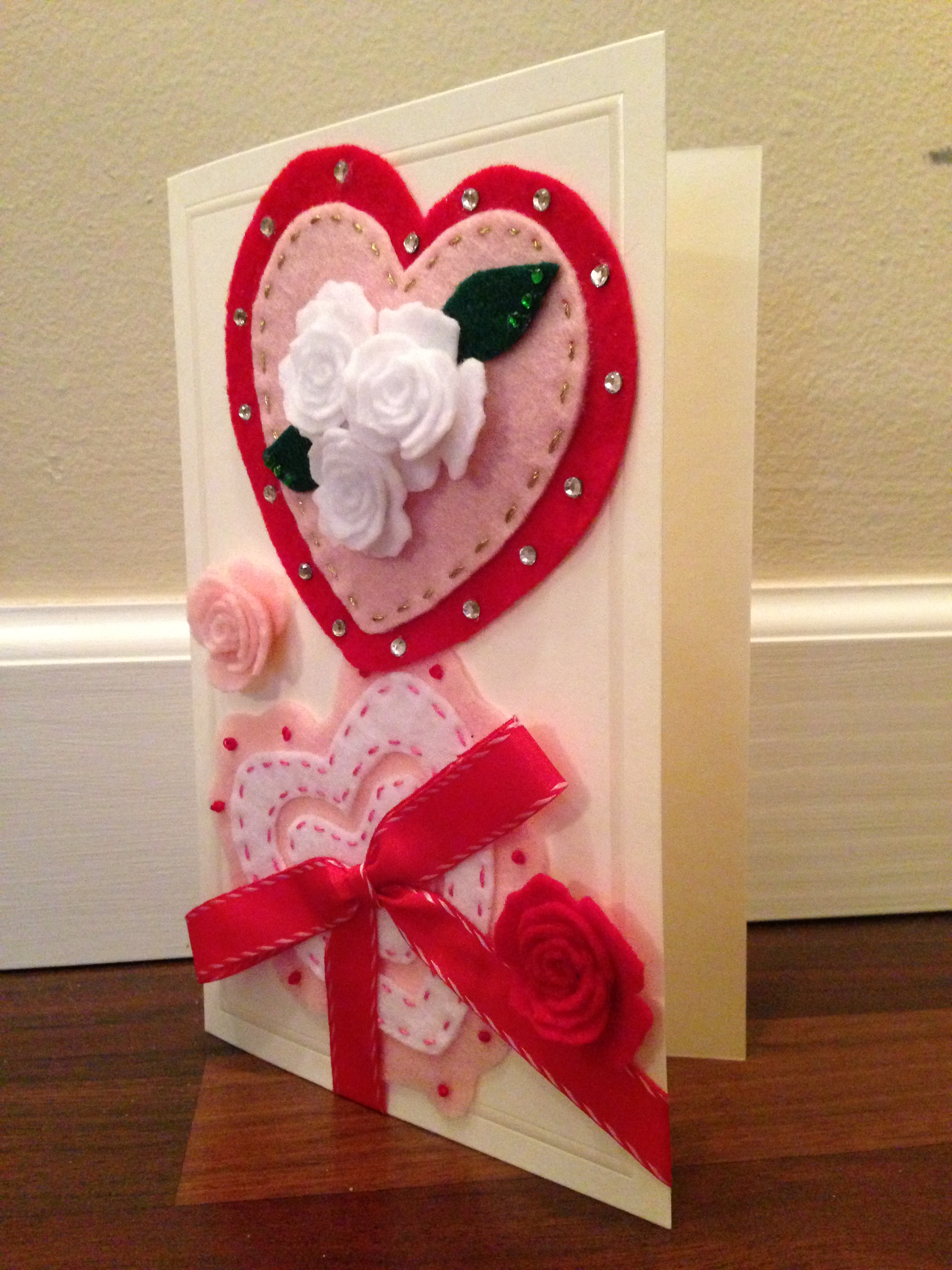 Pictured above is my Mom’s V-day Card. The card is made of felt, rhinestones, embroidery floss, and ribbon. She loved it especially the felt roses, which I cut out by hand.