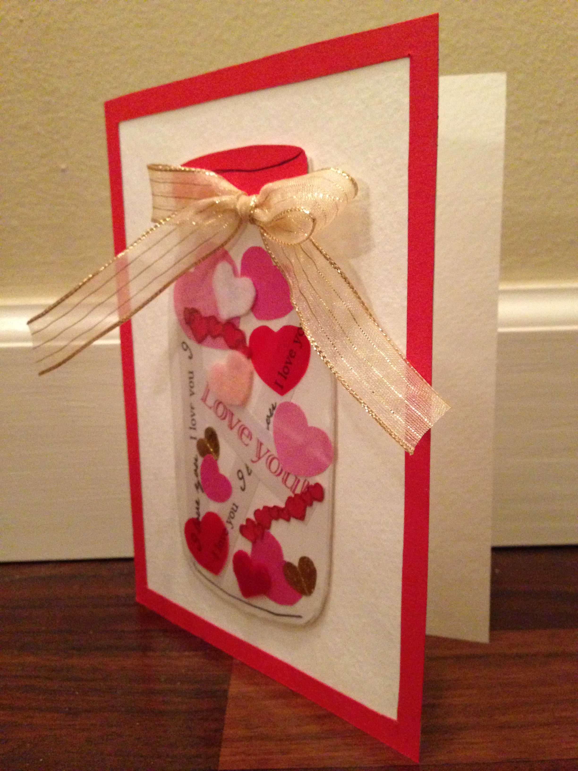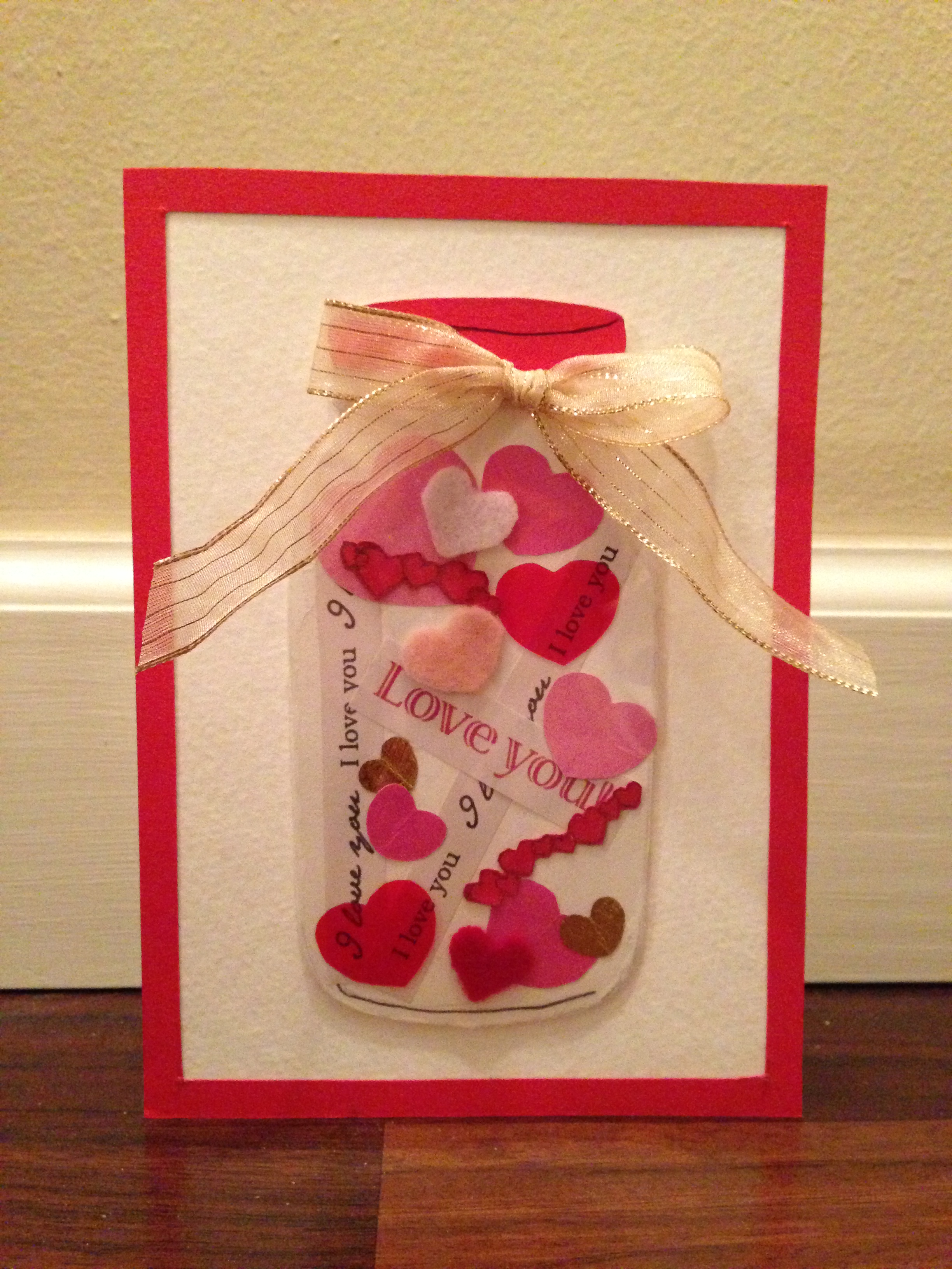 The V-day Card shown above is my Dad’s. His card is made out of felt, vivid construction paper, acetate, ribbon, and illustration board to make the jar look more 3-D. I put a clear acetate over the jar to make it look more realistic because the acetate reflects light like glass. He also, loved his card and called me to let me know that he and my Mom appreciated there cards.