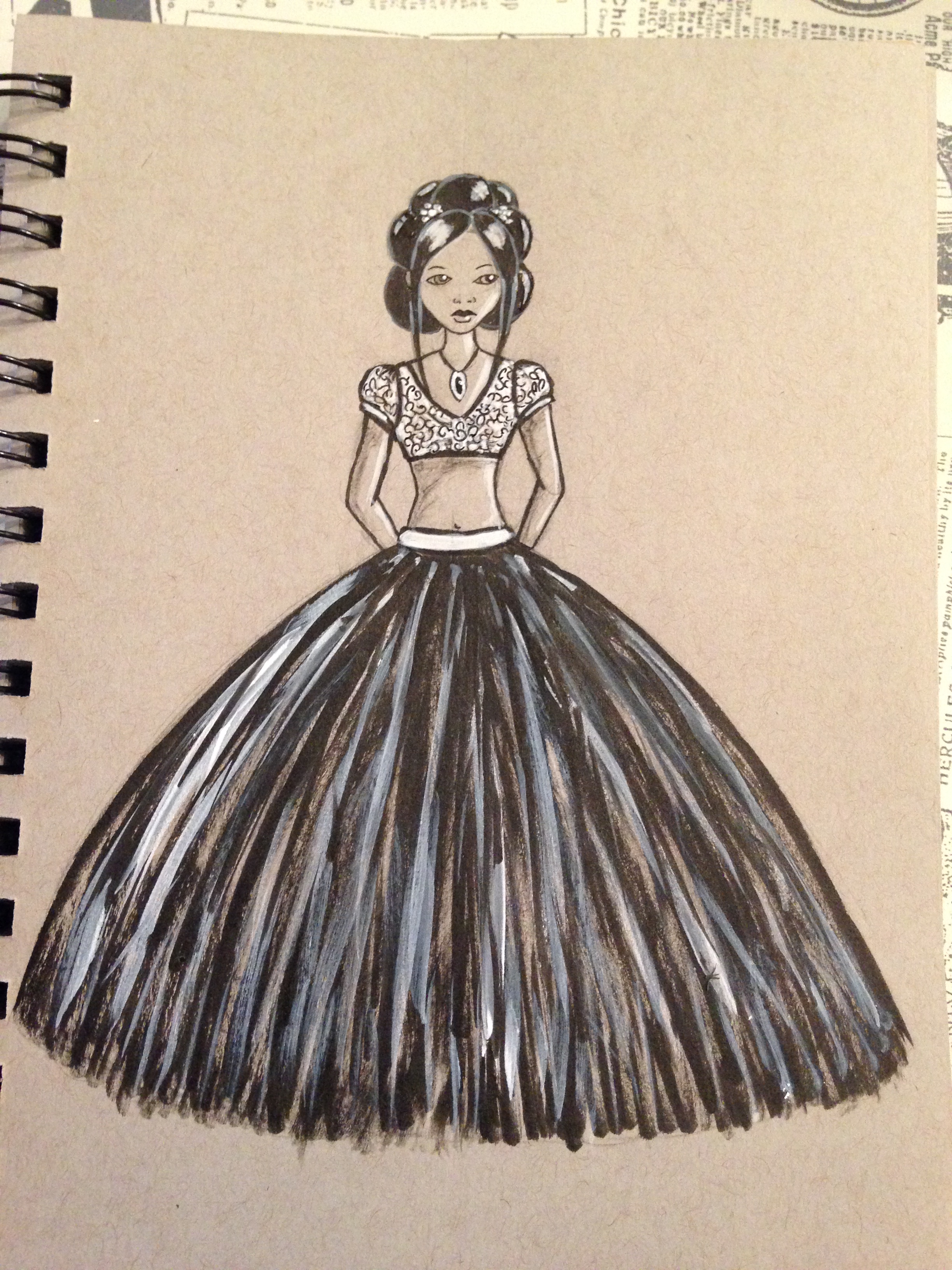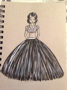 Day 1 – I was just playing around with the paper and micron/white gel pens I had. I was thinking about textiles and used the black paper to make a pleated skirt.