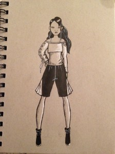 Day 3 – I wanted to sketch a girl with big hair (hair goals) and a fun graphic on her shirt. It was between a juice box or a teddy, as you can see juice box won.